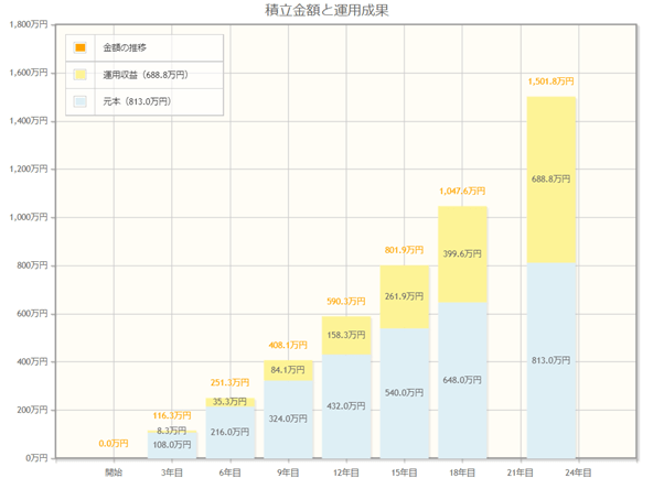 上記の積立金額・目標金額・想定利回りでシミュレーションを行うと、約22年7ヶ月で目標に達する計算になります。