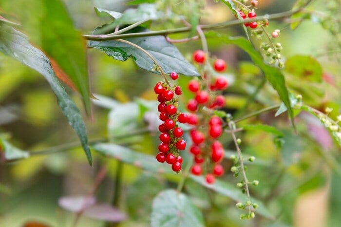 ヤマゴボウ科のジュズサンゴは、ひとつの枝にたくさんの小さな実をつける多年草。茎が木質化するため低木に分類されることもありますが、寒さに弱いため一年草として扱われることもあります。