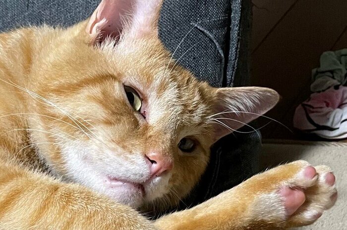 写っているのは、茶トラ模様と口周りの白毛が印象的な猫ちゃん。座椅子の上で体を丸め、リラックスしている最中のようです。