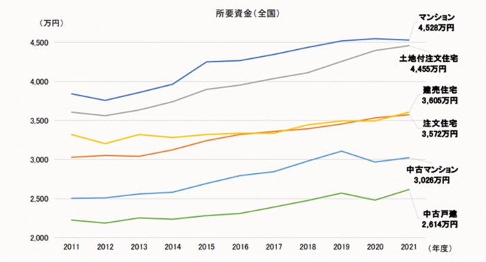 全体の傾向として、ここ10年は右肩あがりとなっています。建築資材の高騰などさまざま要因により、住宅購入のハードルは高まっていると考えられます。