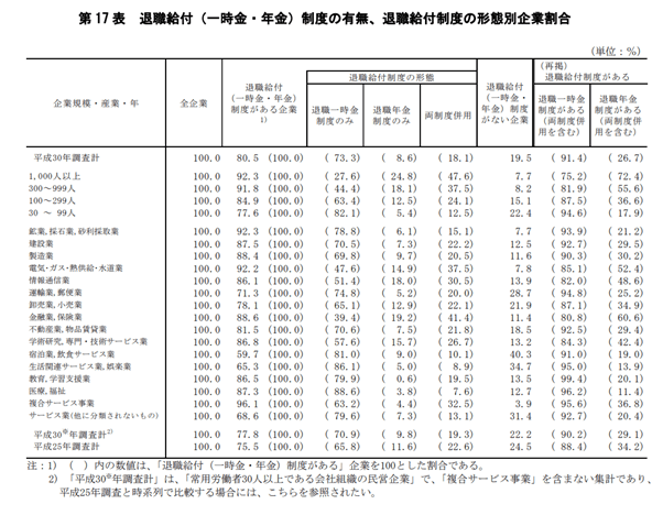 少し前の資料にはなりますが、厚生労働省が公表した「平成30年就労条件総合調査」によると、退職給付(一時金や年金)がある企業は、約80.5%となっています。