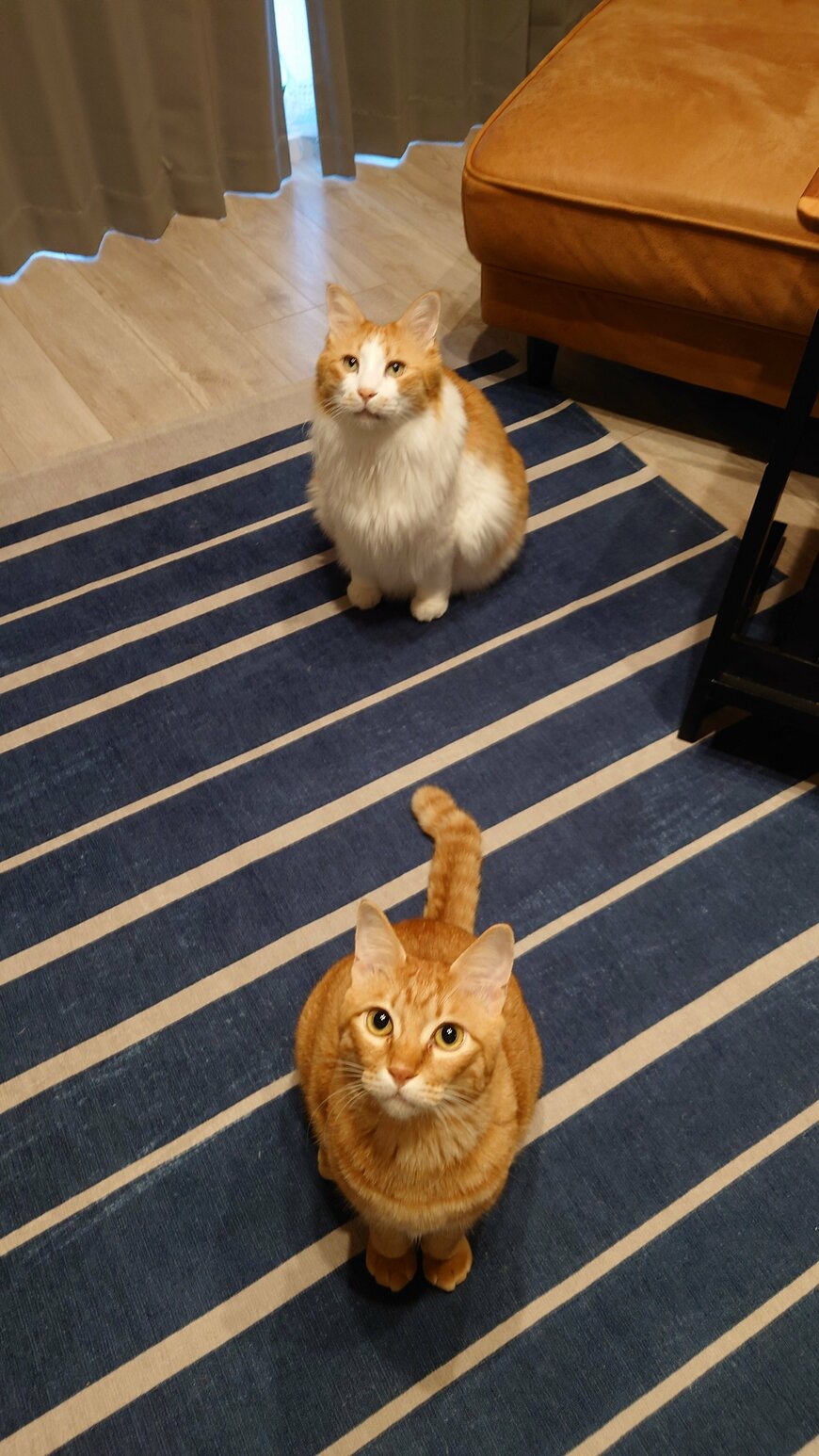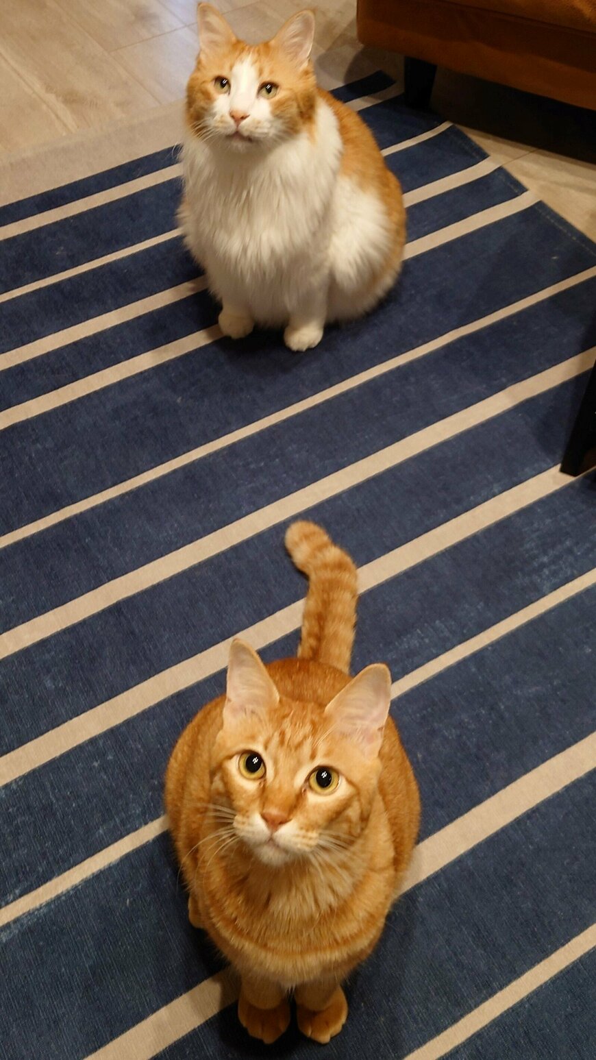 飼い主さんの前に集合して、熱い視線を送る2匹の猫ちゃん。どうやら「ちゅーるをもらえる!」と勘違いしてしまったようです。