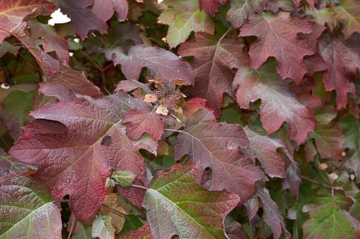 カシワバアジサイは名前のとおり葉がカシワの木にそっくり。大きな葉が秋になると深紅に紅葉してキレイです。アジサイの仲間で5~7月にかけて房状の白い花を咲かせます。