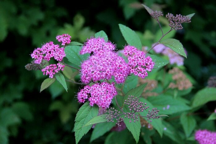 シモツケは現在の栃木県にあたる下野(しもつけ)で最初に見つけられたことが名前の由来。春から夏にかけて白やピンクの花を無数に咲かせます。花は目立たず控えめで優しげな印象。