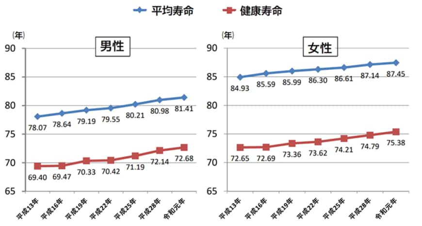 一方で、厚生労働省「健康寿命の令和元年値について」によると、男性の健康寿命は72.68歳、女性の健康寿命は75.38です。