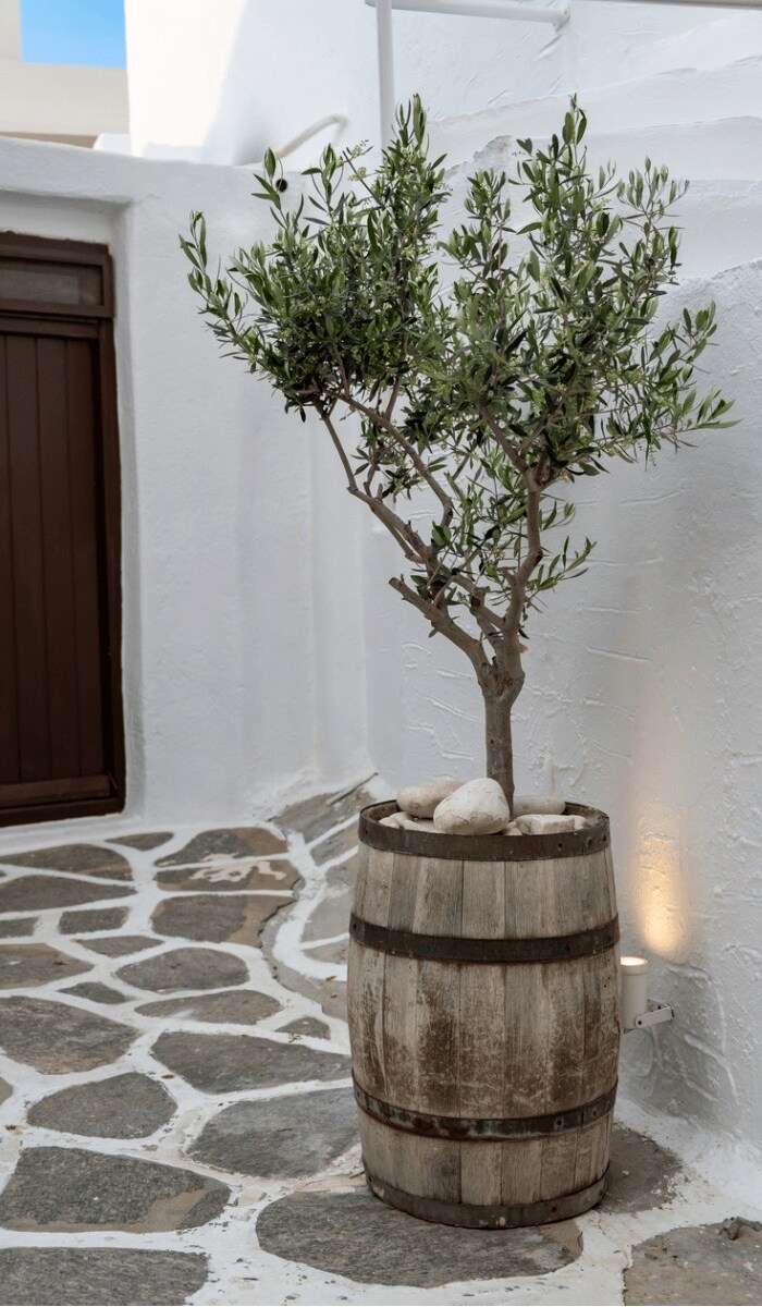 オシャレな庭木のオリーブは庭の鉢植えにオススメのシンボルツリー。細長く濃い緑がとてもクールな印象です。樹形を整える剪定が難しいので、初心者はある程度育った樹木を購入するのがオススメです。