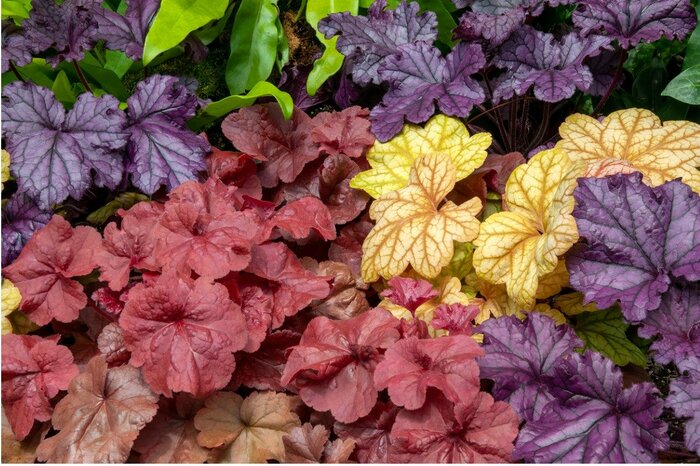 レッドやオレンジ、イエロー、パープルなど、さまざまな色合いがあるのでヒューケラだけの寄せ植えも楽しめます。※参考価格:500~700円前後(3号ポット苗)