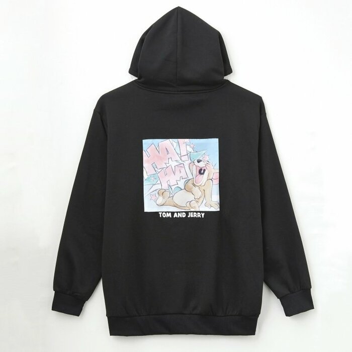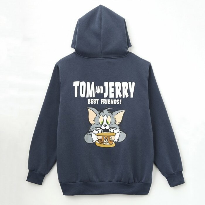 トム&ジェリーのプルパーカーです。裏起毛素材であたたかく、メンズでもレディースでも可愛く着こなせるアイテム。フロントのイラストと大きなバックプリントがかわいい1枚です。