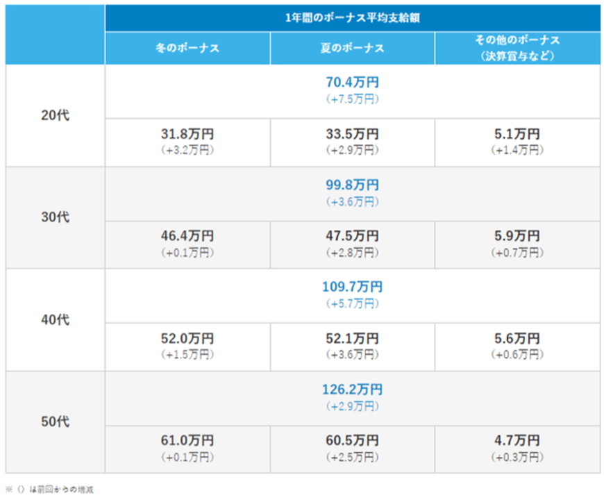 ボーナスの平均支給額「年代別」ではすべてアップ