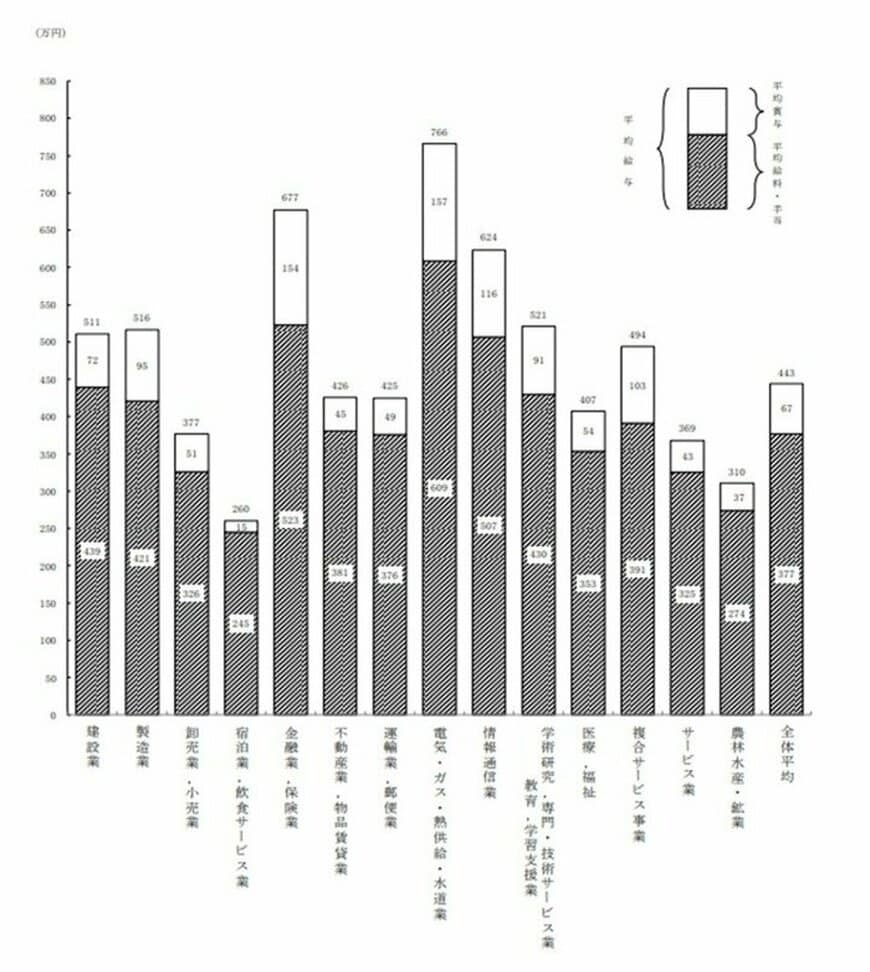 ボーナスと同様、平均年収も業界によって差があることがわかりますね。