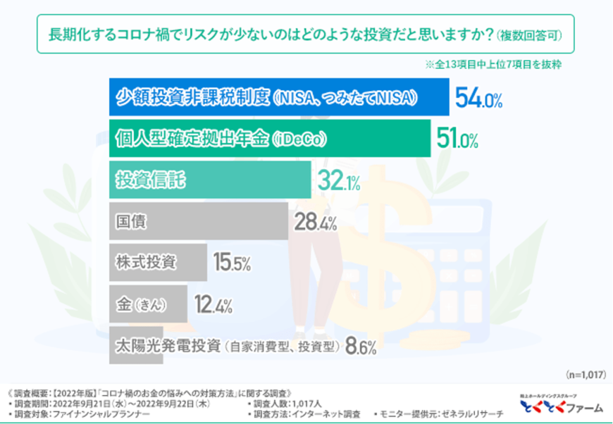 その結果、「長期化するコロナ禍でリスクが少ないのはどのような投資だと思いますか?」と質問したところ、『少額投資非課税制度(NISA、つみたてNISA)(54.0%)』という回答が最も多くなったことがわかりました。