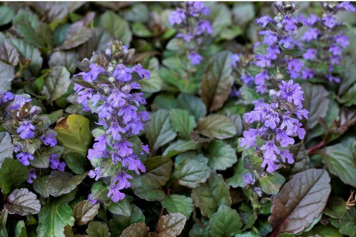 アジュガはグランドカバープランツとして、庭に植えられることが多い常緑の多年草。葉の色がさまざまで、特に銅葉や美しい花色の品種は大人っぽい庭を演出するのにオススメです。