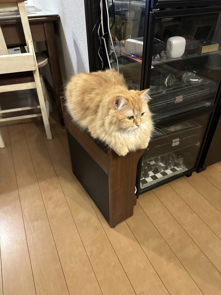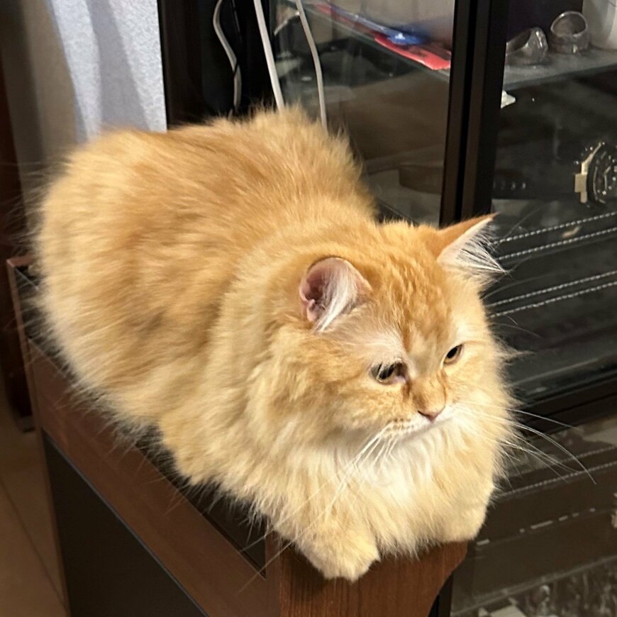 写真に写っているのは、茶色の長毛が印象的な1匹の猫ちゃん。きれいな真四角になって、台の上に座り込んでいます。