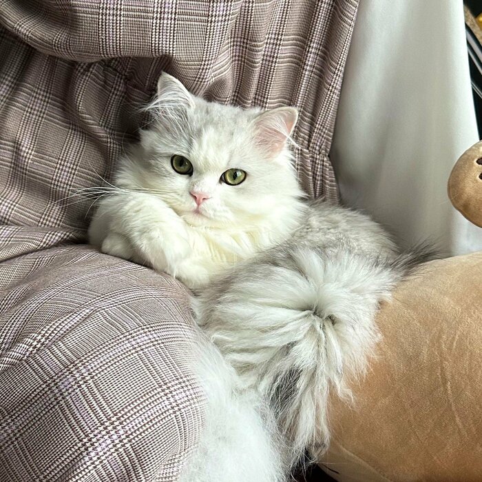 写真に写る猫ちゃんは、ミヌエットの男の子「ノーマン」くん。奥様の膝の上に手を掛け、なんだか勝ち誇ったような表情でカメラに視線を向けています……!