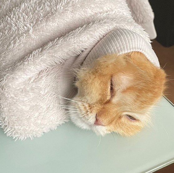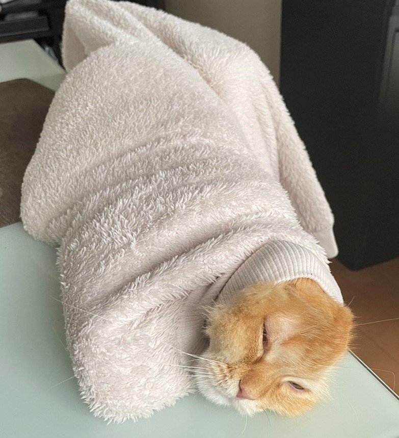 白い上着にくるまっているようですが、袖部分から顔を出しているのでしょうか?かなりピッチリとフィットしていて、なんだか面白い姿になってしまっています……。まさに「本気の生え」といった具合です。