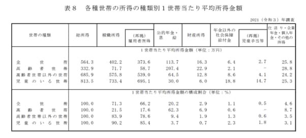 厚生労働省「2021年 国民生活基礎調査の概況」から、高齢者世帯の平均所得は年332万9000円です。