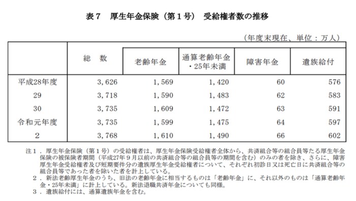 同様に「通算老齢年金・25年未満」の受給権者数を確認します。