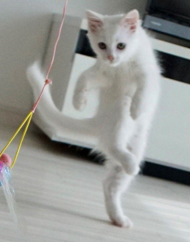 真剣な表情でおもちゃを狙っているようですが、目に飛び込んでくるのは独特なポーズ!一本の後ろ足だけで立つその姿は、まるでサッカー少年のようにも見えます……!