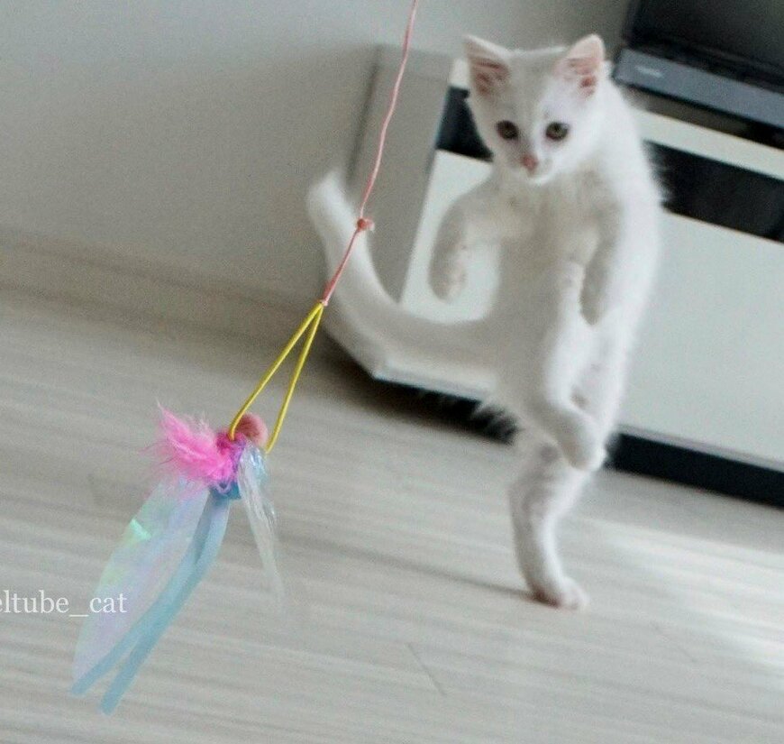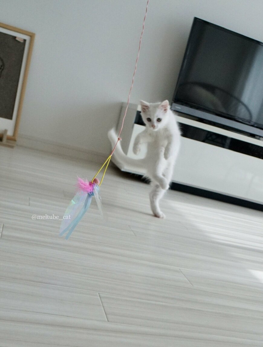 「おもちゃを狙う姿…(笑)」というツイートとともに投稿されたのは、とってもきれいな白毛が印象的な、猫ちゃんの写真です。