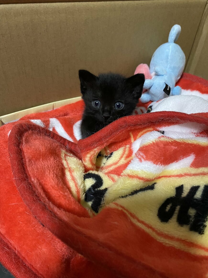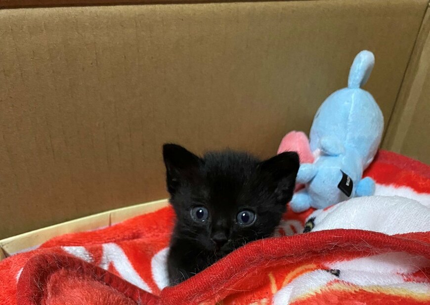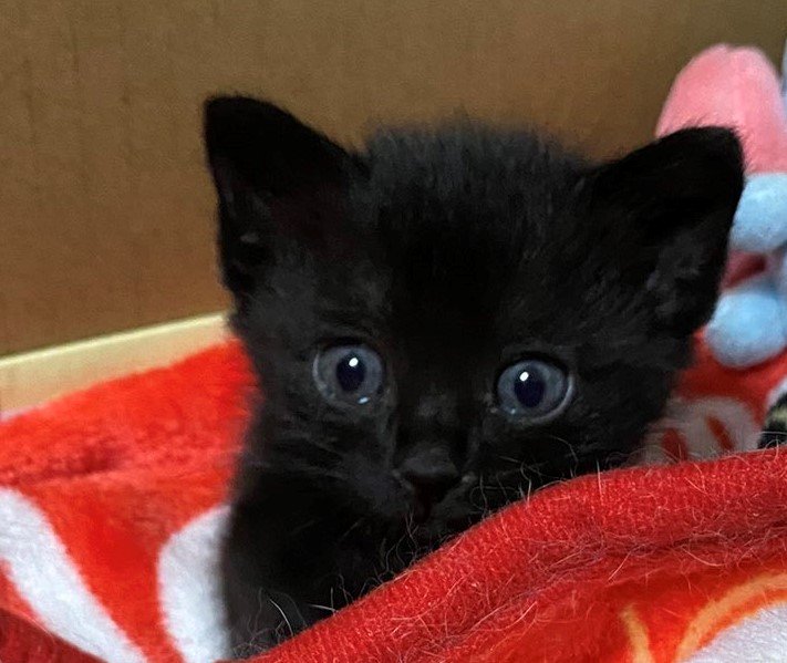 ちっちゃな体とまん丸のおめめが愛らしい「ウニ(仮名)ちゃん」です。推定生後1ヶ月ほどだそうで、あどけなさが伝わってきますね。真っ黒な毛並みに映える、まん丸のおめめがとってもキュート……!