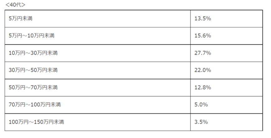 年代別に見てもほとんどの年代で同様の傾向が見られ、例えば40歳代では「10万円~30万円未満」の27.7%、「30万円~50万円未満」の22.0%と続きます。