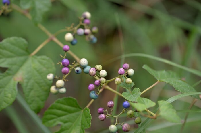 観賞用としても人気が高い野ブドウは形のよい葉と可愛らしい実が特徴の植物。壁や他の植物に這わせて、さまざまな誘引の仕方で楽しめます。