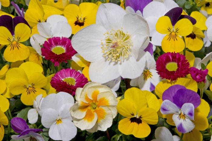 草丈が高いクリスマスローズの株元にはパンジー・ビオラがピッタリ。クリスマスローズをうまく引き立てます。