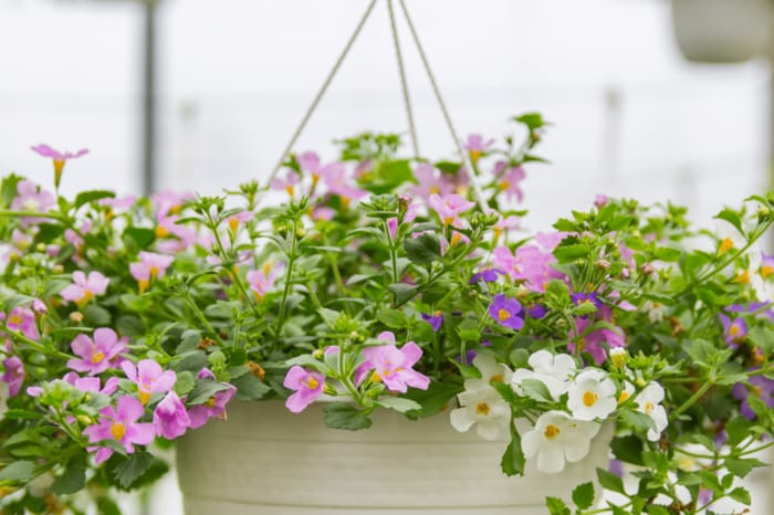 12月くらいまで花が楽しめるバコパは愛らしい小花が特徴の多年草。パープルや白の花が咲き、枝を伸ばして垂れるように咲きます。