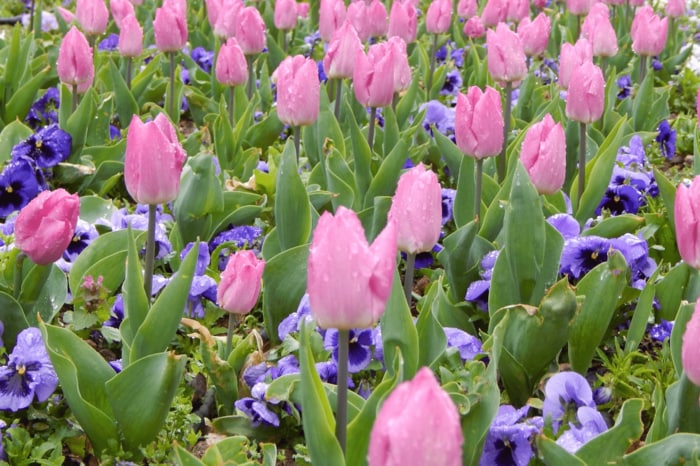 チューリップの球根とパンジー・ビオラの苗を一緒に植えておくことで、春には両方の美しいコラボレーションを楽しむことができます。