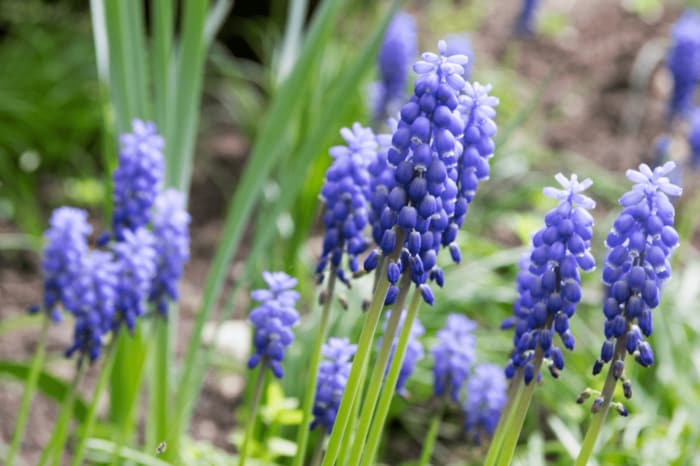 ブルーやホワイトの爽やかな花を咲かせるムスカリ。ムスカリは球根植物で、植えっぱなしでも翌年花を咲かせる多年草です。