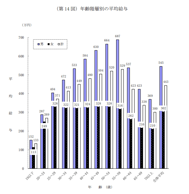 男性では60歳未満までは年齢が高くなるにしたがい平均給与も高くなり、55~59歳の階層(687万円)が最も高くなっています。