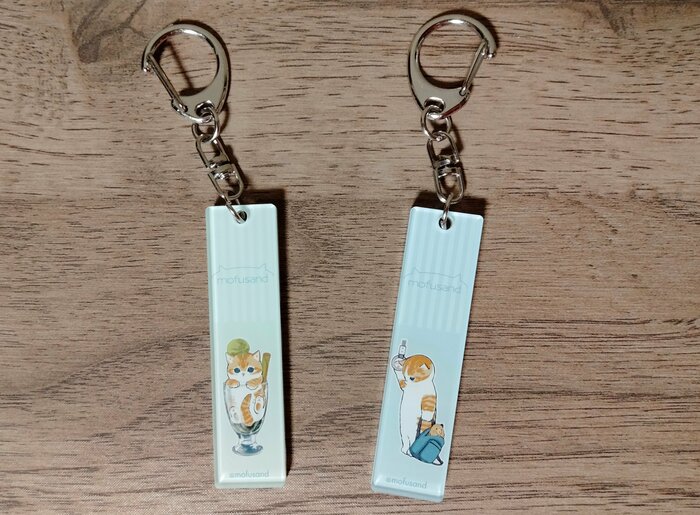 写真のように、長細いデザインが素敵なキーホルダーです。フロートに入っている猫(左)と電車内の猫(右)の2種があります。商品情報をまとめると以下の通りです。
