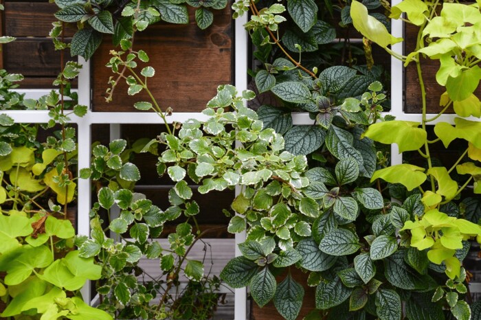 スペースが狭く、背の高い植物を植えにくい場合は、ツル性植物を縦に這わせてみるのもオススメ。平面で高さのある小型トレリスなども販売されているので、活用してみるのもよいでしょう。