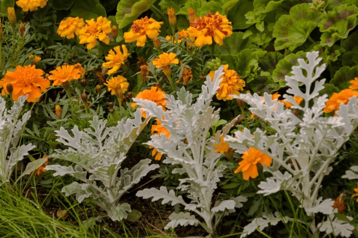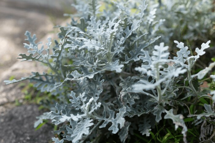 シロタエギクはシルバーの葉が美しいカラーリーフプランツ。暖かみのある雰囲気なので、今の季節にはピッタリです。矮性の品種もあるので、他の植物とのバランスをみて選ぶとよいでしょう。