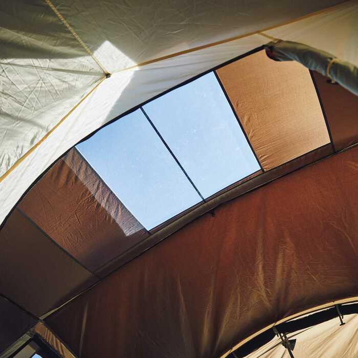 氷点下から30度を越す気温まで、オールシーズン対応できる機能を備えた「4Sワイド2ルームカーブ」。フライ本体の耐水圧が3000mmと、雨でも安心な設計です。ルーフフライやキャノピーポールが標準装備されている点も魅力。リビングには天窓があり、開放感もたっぷり味わえます。