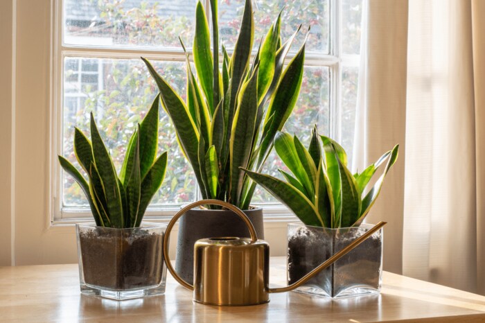 スラリと伸びた葉がオシャレなサンセベリアは人気の観葉植物。肉厚の葉は乾燥に強く、空気をキレイにする効果があるとも言われています。
