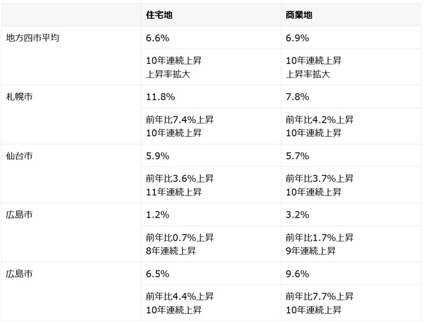 先述した福岡だけでなく、地方四市に含まれる札幌市、仙台市、広島市でも上昇が継続し、かつ上昇率も拡大しています。