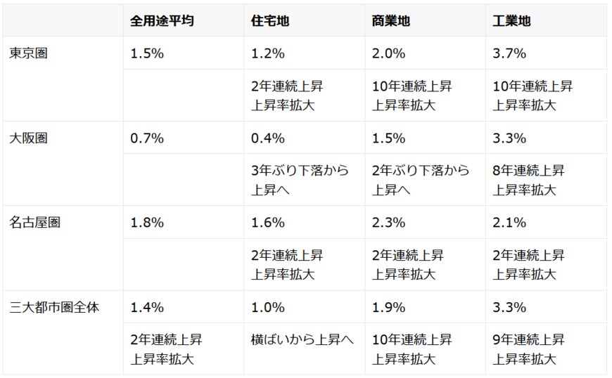 東京圏、大阪圏、名古屋圏を含む三大都市圏でも地価の上昇が見られています。特に注目したいのは、数年ぶりに下落から上昇へ転じた大阪圏です。