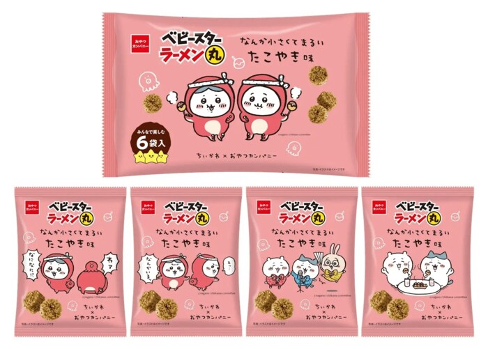 「ベビースターラーメン丸」とコラボしたこちらの商品は、シェアして食べるのに便利な6袋入り。全国のスーパーマーケットで発売中です。たこ焼きの味わいが1粒にギュッと詰まっており、タコに扮した「ちいかわ」「ハチワレ」の姿も必見です!