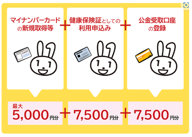 マイナンバーカードの新規取得等で最大5000円分のマイナポイントがもらえます。さらに、健康保険料としての利用申込みで7500円分、公金受取口座の登録で7500円分をあわせると、最大2万円分ものマイナポイントを受け取ることができます。