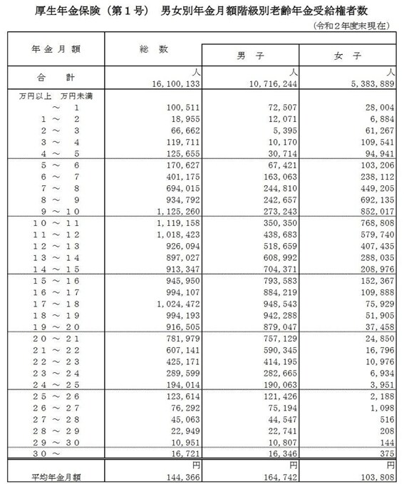 ここからは、厚生労働省が公表する「令和2年度 厚生年金保険・国民年金事業の概況」をもとに、厚生年金の平均月額や受給額の分布を見ていきます。