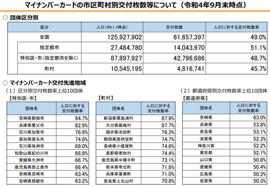 マイナンバーカード「郵便局3000か所」で申請へ。マイナポイント第2弾も解説 マイナンバーカードの普及率 2022.11.06 19:00 公開 執筆者齊藤 慧 copy URL 目次[開く] マイナンバーカードの普及「郵便局」を活用 マイナンバーカードのメリット5選 マイナンバーカードのメリット1. 個人番号を証明できる マイナンバーカードのメリット2. 1枚で本人確認ができる マイナンバーカードのメリット3. 証券口座開設など民間のオンラインサービスで使える予定 マイナンバーカードのメリット4. コンビニで住民票の写しなどの公的な証明書を取得できる マイナンバーカードのメリット5. 健康保険証として利用できる マイナンバーカードの交付率はどれくらいか マイナポイント第2弾で最大2万円がもらえる?内容をおさらい マイナポイント第2弾その1. 新規取得等で最大5000円分 マイナポイント第2弾その2. 健康保険証としての利用申込みで7500円分 マイナポイント第2弾その3. 公金受取口座の登録で7500円分 マイナンバーカードの普及は今後加速するか 参考資料 マイナンバーカードの交付率はどれくらいか マイナンバーカードは現在、どれくらいの人が所持しているのでしょうか。 総務省によると、マイナンバーカードの交付率は49.0%(2022年9月末時点)です。 出所:総務省「マイナンバーカードの市区町村別交付枚数等について」(2022年9月末時点) すべての画像を見る(3枚) 交付率は、地域によって差があるようです。 マイナポイント第2弾で最大2万円がもらえる?内容をおさらい < 2 3 4 5 6 > 関連タグ #マイナポイント #マイナンバーカード 注目コンテンツ 女性特有のがんは40代から増える?女性向け医療保険で備える[PR] 年齢入れて5秒で見積もり!人気の医療保険ランキングをチェック[PR] 【LIMOで懸賞】新しいプレゼントが続々登場中!最新情報はこちらから[PR] あわせて読みたい