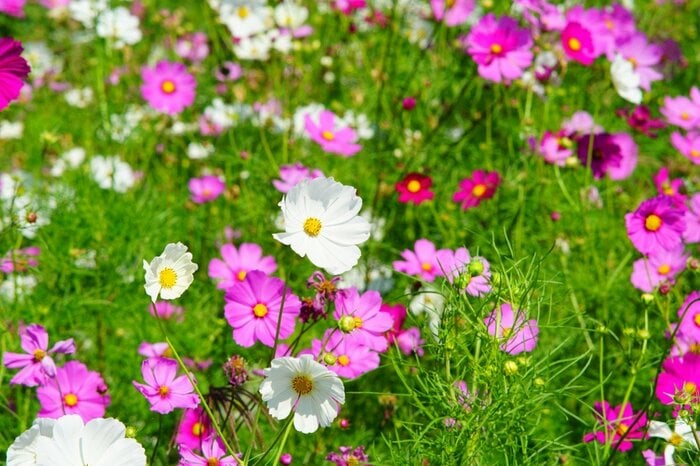 花言葉は色によって変わり、ピンクだと「純潔」、黄色やオレンジだと「自然美」、チョコレートコスモスは「恋の思い出」。