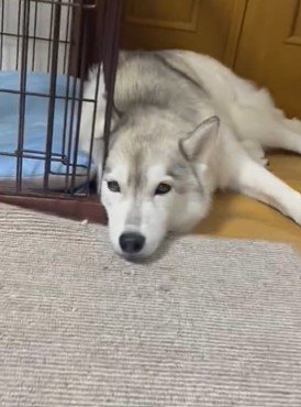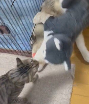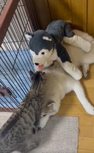 動画に写っているのは、キジトラ猫の男の子「サンくん」と、シベリアンハスキーの女の子「ユキちゃん」です。ユキちゃんの上には、犬のぬいぐるみが乗っているようですが……?