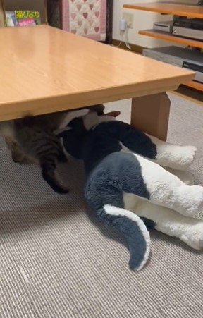 そして、ぬいぐるみの耳や鼻をガブガブ。ぬいぐるみをくわえたサンくんが向かった先は、テーブルの下でした。