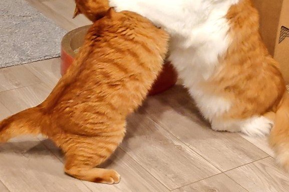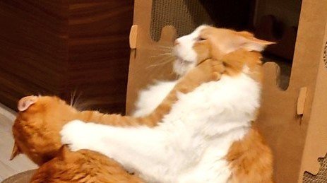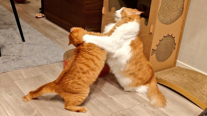写っていたのは、モフモフの毛並みをした猫ちゃんと茶トラの猫ちゃん。2匹は八の字の体勢になってじゃれ合っていますが、その光景はまさに「猫相撲」……!
