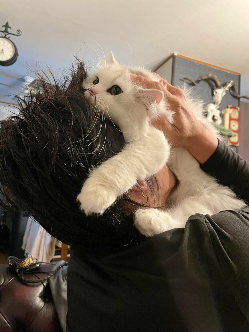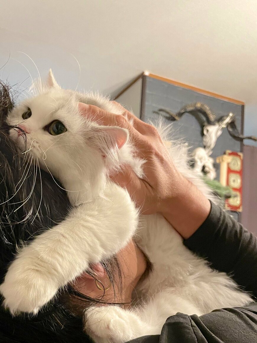 お風呂上がりと見られる飼い主さんにモフッと抱き上げられて、体をぴったり密着させていますね。ツイートどおり、猫ちゃんがタオルになっているかのよう。まさに「猫吸い」という表現がぴったりな光景です。