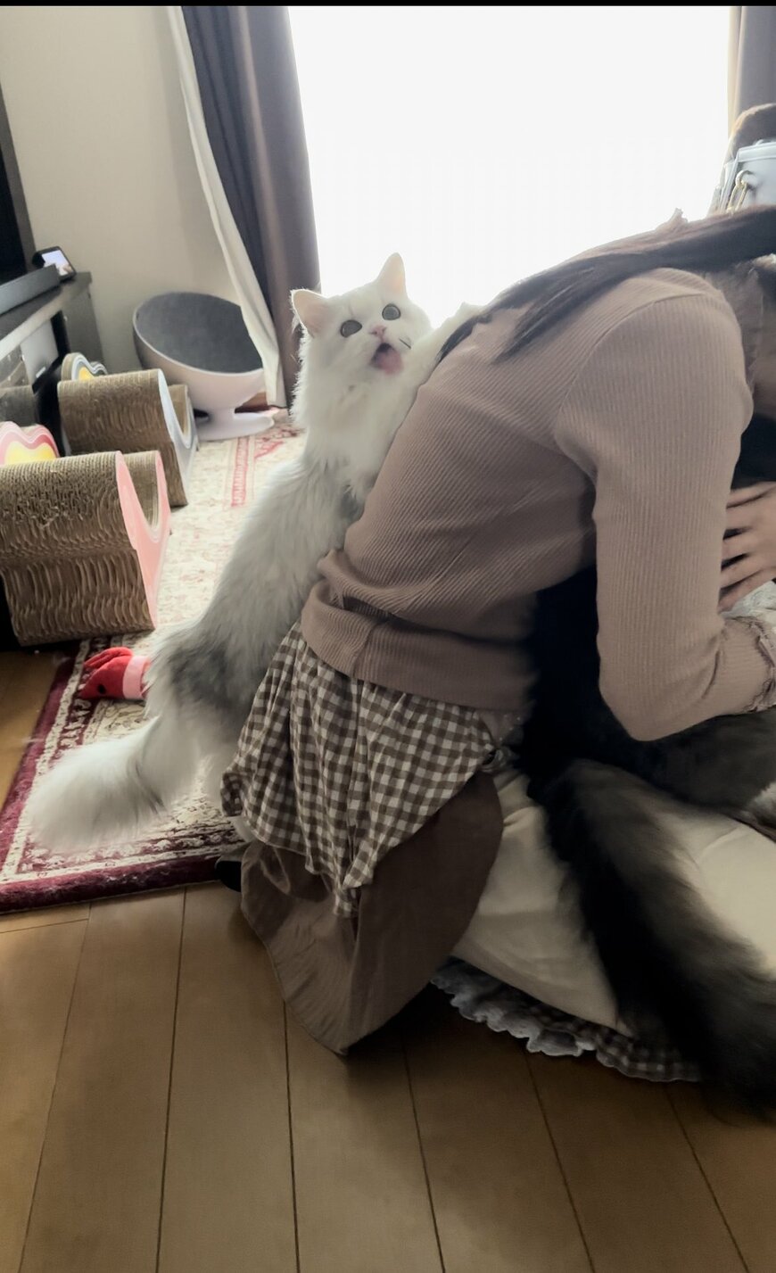 「大好きなママさんを先輩猫に取られて必死にアピールする後輩猫。」という書き込みとともに投稿されたのは、1枚の写真でした。