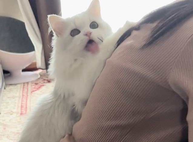 先輩猫ちゃんを抱きしめるママの姿を見て、やきもちを妬いてしまったのでしょうか。舌を出して、大きな瞳をカッと開くノーマンくんの表情からは、構ってほしい気持ちと絶望感が伝わってきます……!ママの背中に手を掛けて、一生懸命アプローチしていますね。