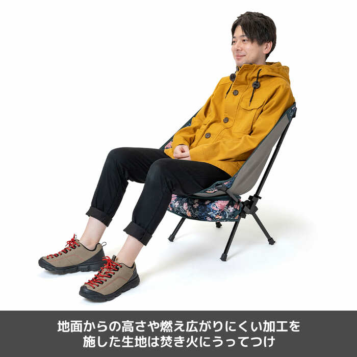 座面に燃えにくい加工が施された、焚き火まわりでも安心して使えるローチェアです。座面が広く地面との距離が近いので、足を伸ばしてリラックスして座ることができます。車に積んだままにしておきやすい、コンパクト収納ができるのもいいですね。特別な道具もいらない簡単組み立て式なので、キャンプビギナーにもおすすめです。